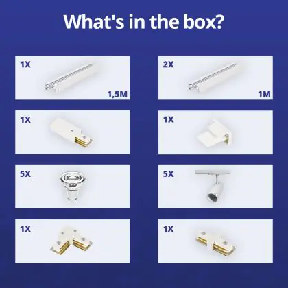 Beschrijving Complete Set 1-Fase Rail L 1,5 x 2 Meter Wit | incl. 5x Spot + GU10 2700K 3W Dimbaar + Eindkap, Voedingsconnector en L -Verbindingsstuk