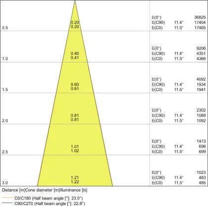 De gradenbundel geeft informatie over hoe breed het licht wordt uitgestraald. Dit zit tussen de 0 en 360 graden (D). Hoe kleiner de hoek, hoe specifieker de lichtbundel is. Over het algemeen is een smalle gradenbundel perfect voor sfeer- of accentverlichting, terwijl een brede gradenbundel ideaal is om grote oppervlaktes te verlichten.