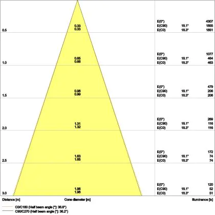 De lichtopbrengst en de gradenbundel spelen een grote rol. Zo geeft de lichtopbrengst van 510 Lumen in combinatie met de 36° stralingshoek deze inbouwspot een specifieke toepassing. Kort samengevat is een lichtintensiteit van maximaal 400 Lumen ideaal voor accentverlichting, terwijl hogere waardes goed gebruikt kunnen worden als basisverlichting. Over het algemeen geldt: hoe breder de gradenbundel, hoe geschikter deze is door basisverlichting. Dit komt doordat het licht over een groter oppervlak wordt verspreid. Smallere gradenbundels (tot 40°) kunnen echter bij hoge plafonds ook goed tot hun recht komen als algemene verlichting.